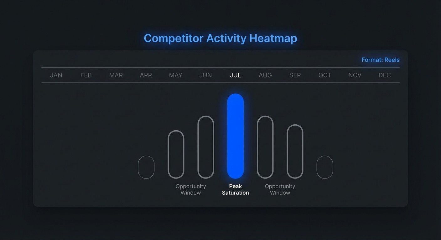 Peak Activity Mapping: Visualize exactly when competitors flood the market (seasonality) and when they go quiet, allowing you to own the "white space" in the ears of your audience.